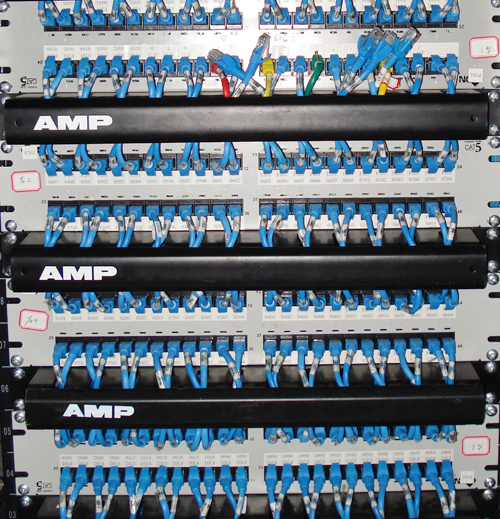 5) 管理子系統(tǒng)(Administration) 它是干線子系統(tǒng)和水平子系統(tǒng)的橋梁,同時(shí)又可為同層組網(wǎng)提供條件。其中包括雙絞線跳線架、跳線(有快接式跳線和簡(jiǎn)易跳線之分)。在需要有光纖的布線系統(tǒng)中,還應(yīng)有光纖跳線架和光纖跳線。當(dāng)終端設(shè)備位置或局域網(wǎng)的結(jié)構(gòu)變化時(shí),只要改變跳線方式即可解決,而不需要重新布線。